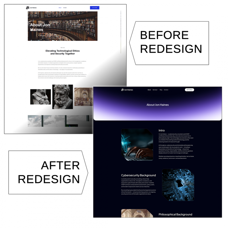 Jon Haines, a certified cybersecurity professional and avid philosophy writer, approached us for a comprehensive redesign of his personal website, jonhaines.com. His site serves dual purposes – showcasing his cybersecurity consulting services and hosting his philosophy blog – and it needed to make a stronger professional impression. The existing site was built with Elementor and had begun to show its limitations in visual polish, speed, and mobile usability. Our mission was to rebuild the site on WordPress using the Flatsome theme (a modern, open-source alternative to heavy page builders). We set out to elevate the site’s aesthetics and performance while preserving all of Jon’s content and the distinct focus of each section (cybersecurity and philosophy). The end goal: a fast, visually engaging, mobile-friendly site with cohesive branding across both sections and a streamlined user experience for both Jon and his visitors.