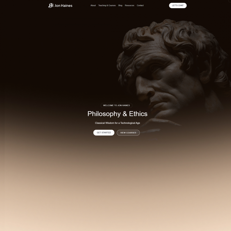 Cohesive Branding Across Sections: Using a single theme for both the cybersecurity and philosophy sections allowed us to enforce a consistent branding and navigation structure. We designed a universal header and footer for the site, so whether a visitor is reading about cyber risk management or a philosophy essay, it feels like part of the same website. At the same time, we gave each section a bit of its own flavor: for example, the Philosophy section’s hero banner now features a tasteful image of a classical statue bust (a nod to philosophical heritage), while the Cybersecurity side uses a subtle tech-inspired background – creating balance and thematic identity for each. Fonts, color schemes, and graphics are harmonious site-wide. This design consistency reinforces Jon’s personal brand across all his content.
