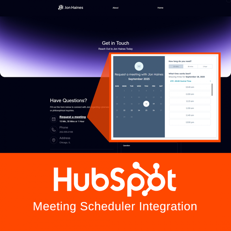 Stronger Calls to Action: To help convert visitors into clients, we implemented the contact improvements Jon requested. We removed the plain email address from the Contact page and anywhere it was publicly visible (reducing spam risk). In its place, we integrated Jon’s HubSpot “Book a Meeting” scheduler across the site, including a prominent call-to-action button in the navigation and on relevant pages. Now, when a potential client is interested, they can instantly schedule a meeting with Jon through an embedded calendar, rather than sending a cold email. We made this CTA stand out visually (at one point, adjusting the styling to be bold and underlined so it wouldn’t be missed). We also ensured every page – whether on the cybersecurity or philosophy side – provides a clear next step for contact, either via the HubSpot scheduler or a short contact form. By standardizing these contact paths and highlighting the “Book a Meeting” option, the site actively invites engagement.