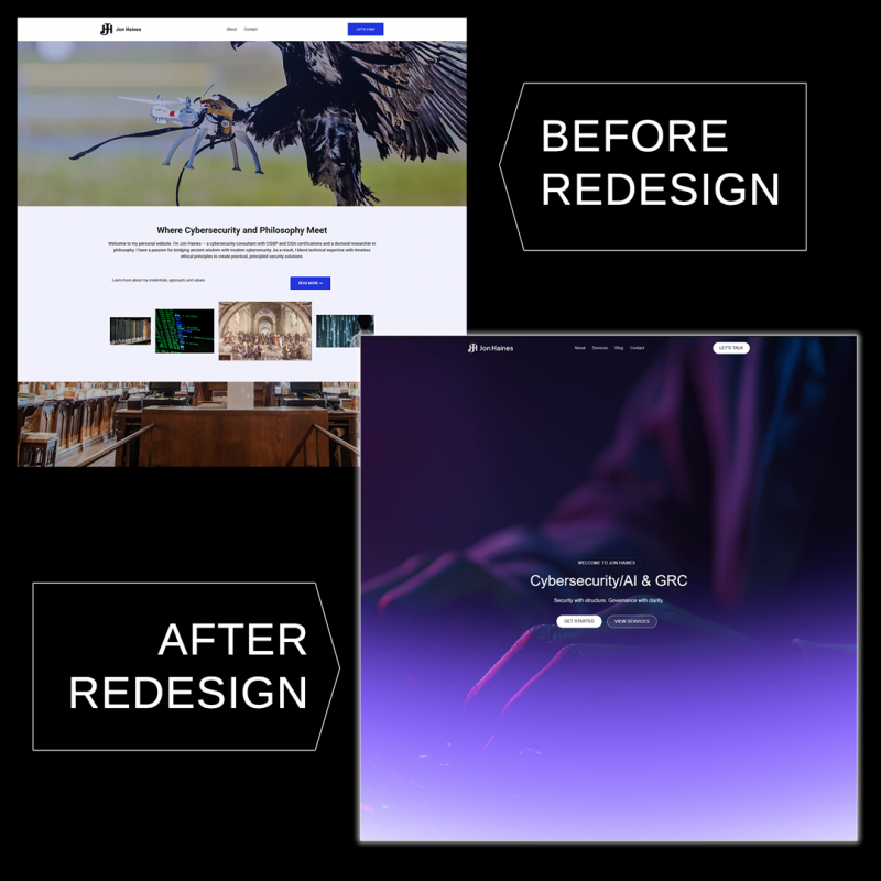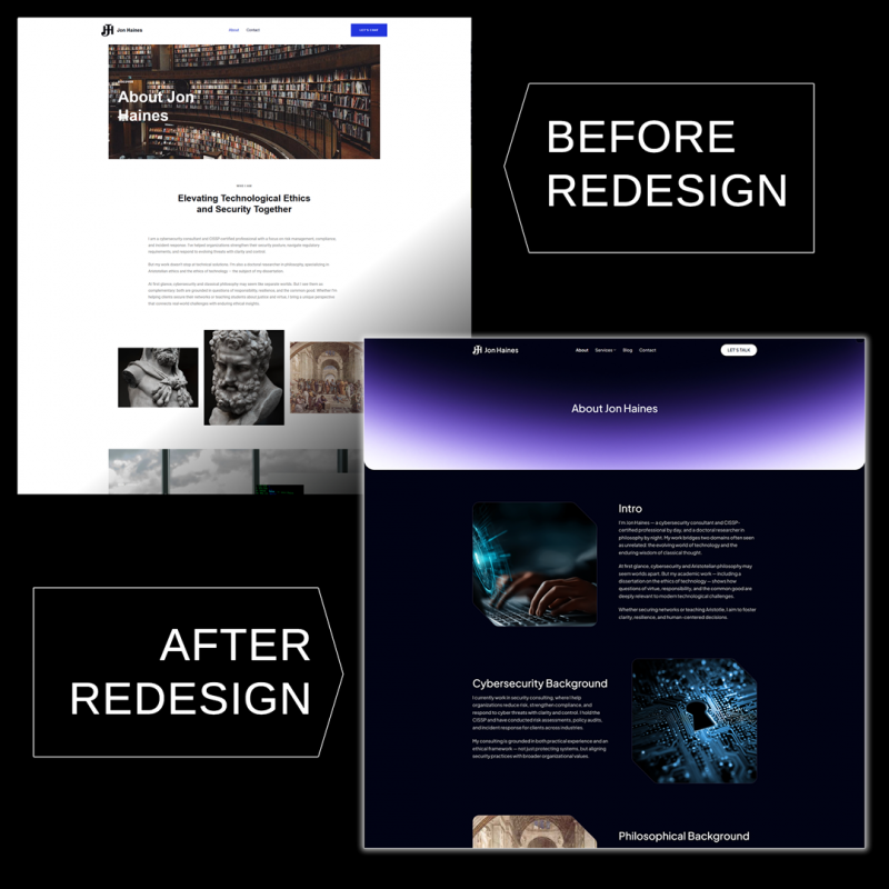 Jon Haines, a certified cybersecurity professional and avid philosophy writer, approached us for a comprehensive redesign of his personal website, jonhaines.com. His site serves dual purposes – showcasing his cybersecurity consulting services and hosting his philosophy blog – and it needed to make a stronger professional impression. The existing site was built with Elementor and had begun to show its limitations in visual polish, speed, and mobile usability. Our mission was to rebuild the site on WordPress using the Flatsome theme (a modern, open-source alternative to heavy page builders). We set out to elevate the site’s aesthetics and performance while preserving all of Jon’s content and the distinct focus of each section (cybersecurity and philosophy). The end goal: a fast, visually engaging, mobile-friendly site with cohesive branding across both sections and a streamlined user experience for both Jon and his visitors.