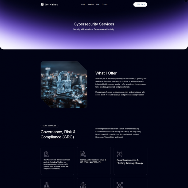 Enhanced Usability & Engagement: Usability improvements have made the site much more engaging and easy to use. Navigation is intuitive, with clear paths to find Services, Blog, Resources, and Contact pages. The addition of the Resources section and internal links helps surface more of Jon’s content to readers (for instance, philosophy readers can easily discover his cybersecurity offerings and vice versa). Interactive elements are now user-friendly – for example, each service “box” on the Services page is fully clickable, which invites exploration rather than causing confusion. We also placed subtle prompts and introductions (like a short welcome message at the top of the blog) to guide new visitors. Overall, the site now has a logical flow: visitors can smoothly learn about Jon, delve into his writings, and understand his services without hitting dead-ends or perplexing UI issues.
