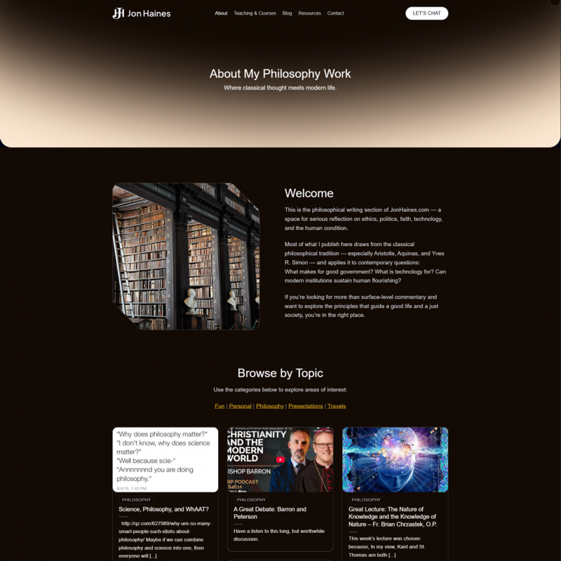 Cohesive Branding Across Sections: Using a single theme for both the cybersecurity and philosophy sections allowed us to enforce a consistent branding and navigation structure. We designed a universal header and footer for the site, so whether a visitor is reading about cyber risk management or a philosophy essay, it feels like part of the same website. At the same time, we gave each section a bit of its own flavor: for example, the Philosophy section’s hero banner now features a tasteful image of a classical statue bust (a nod to philosophical heritage), while the Cybersecurity side uses a subtle tech-inspired background – creating balance and thematic identity for each. Fonts, color schemes, and graphics are harmonious site-wide. This design consistency reinforces Jon’s personal brand across all his content.