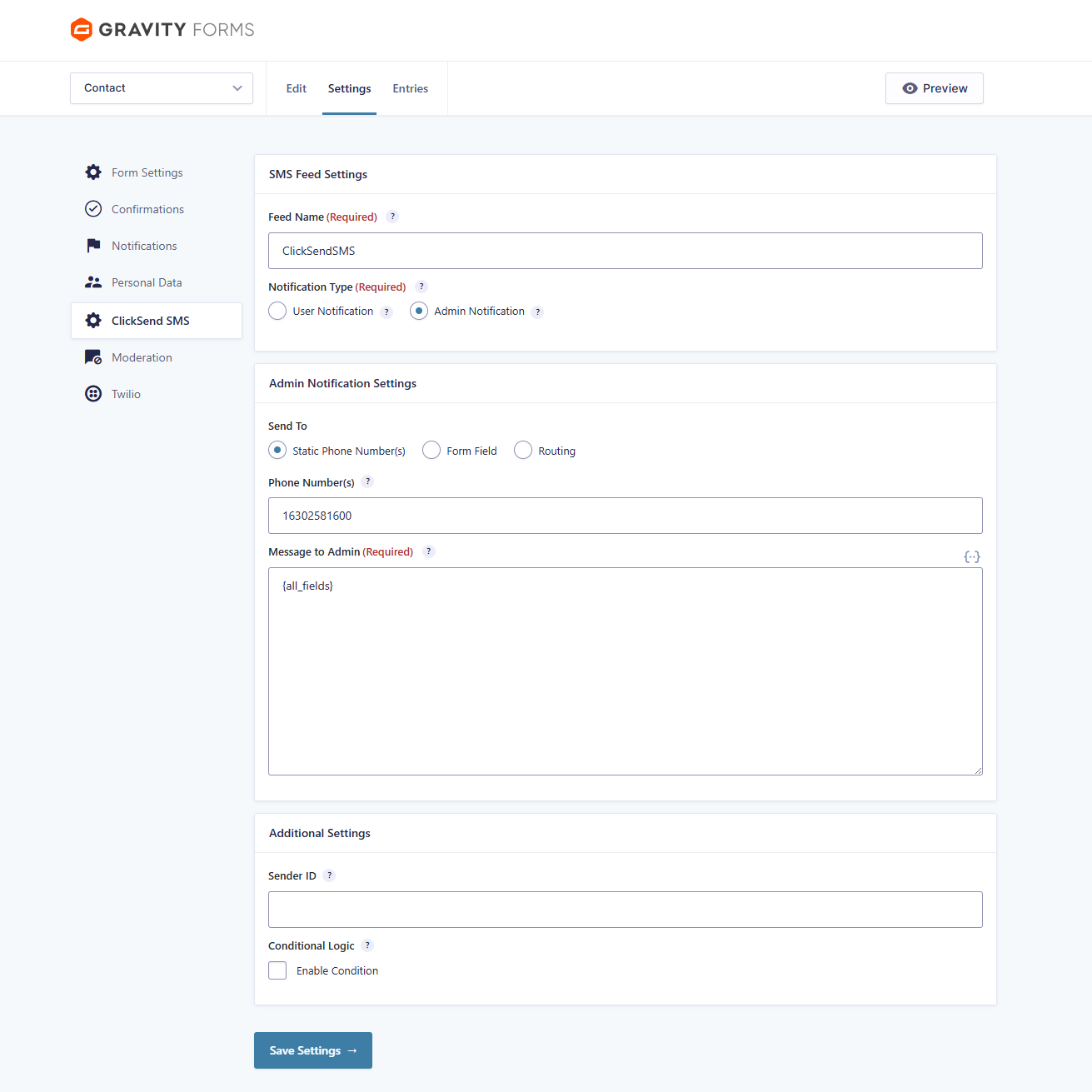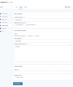 ✓ Multiple SMS feeds per form ✓ User and admin notifications ✓ Automatic US phone formatting (+1) ✓ International number support ✓ Smart routing to different team members ✓ Conditional logic for precise control ✓ Merge tags for personalization ✓ Custom sender IDs (when approved) ✓ Entry notes for delivery tracking ✓ Debug logging for troubleshooting ✓ Clean, professional interface ✓ Follows WordPress & Gravity Forms standards